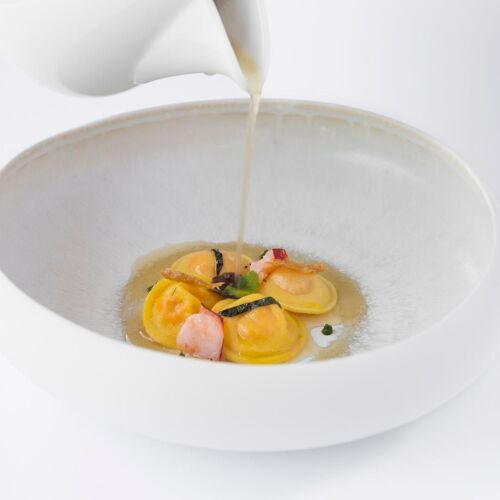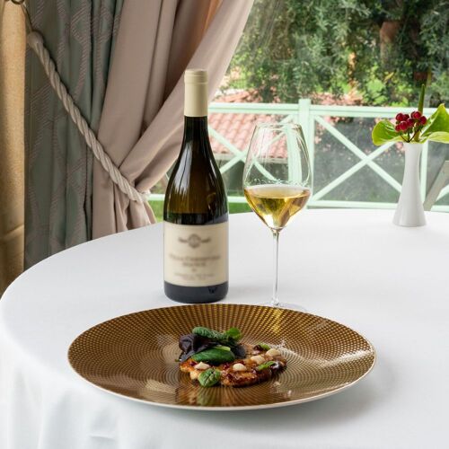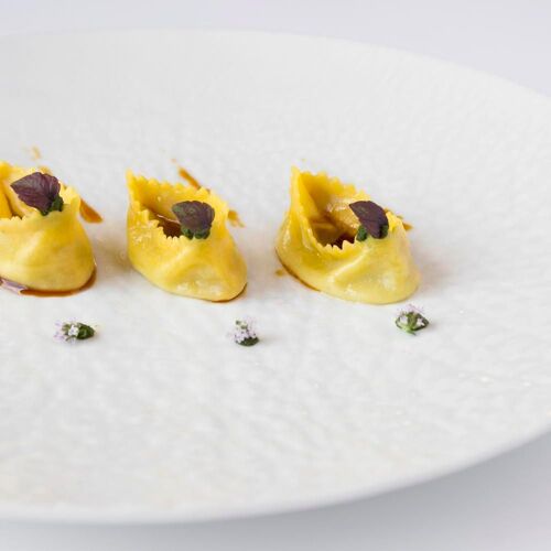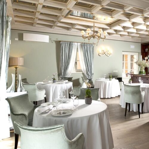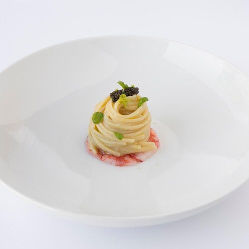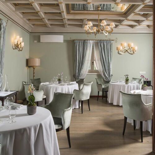 A few kilometers from Lake Garda, on gentle vine‑clad slopes, the entrance to Villa Cordevigo, home to L’Oseleta, makes a grand impression as it opens between two rows of cypress trees. Inside are two intimate dining rooms, but the best tables are in the elegant veranda with wide glass windows, where views of the gardens and pool create a charming atmosphere, made even more delightful by impeccable service. Chef Marco Marras conducts with finesse a menu that ranges across seafood, vegetarian, lake‑inspired, and meat dishes, all presented with near‑surgical precision and refined theatrical flair. Among his signature creations, the Fusillone… my way (2022, but surprisingly up to date) stands out: perfectly al dente pasta with bagna cauda, borage, saffron, roasted eggplant, and cuttlefish ink. The sauces, skillfully harmonized, evoke both marine and earthy sensations on the palate.