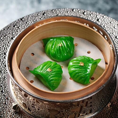 The emerald green and gold room sports panoramic windows so guests can admire the musical fountain while dining. The chef, who worked in Jiangsu, Zhejiang and Shanghai for years, melds the rounded flavours of Jiangnan fare with Sichuanese mala seasoning and Cantonese subtlety and freshness. His eight-treasure roast duck is a hybrid between the Huaiyang and Cantonese varieties – sticky rice is wrapped in crispy duck skin and topped with caviar.