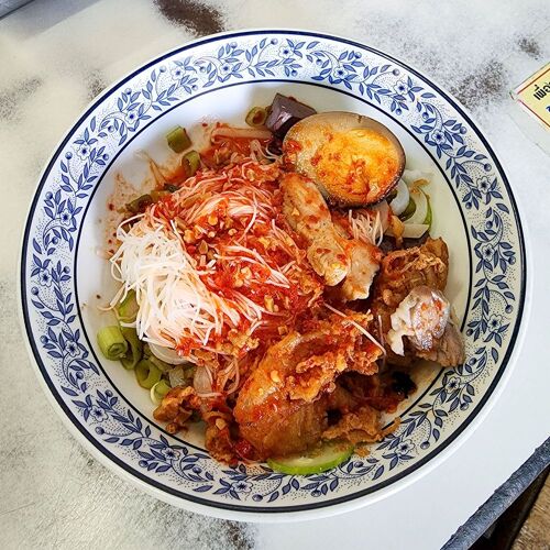 Set in a charming house surrounded by ylang-ylang plants, Sum Gradang Nga is a hit with the locals for its Southern Thai cuisine bursting with gutsy flavours. Take the spicy pork cartilage with piquant seasoning, for example. Alternatively, the crab curry, which exudes umami, is served with vermicelli, fresh vegetables and a sweet-sour cucumber salad. Two dining areas: an alfresco space shaded by trees and a cool interior with a pastel pink décor.