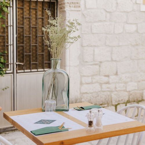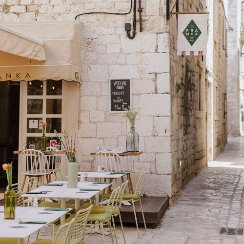 Tra i vicoli del piccolo centro dalmata di Trogir, nascosta nelle immediate vicinanze del ponte che collega l’isola alla terraferma, questa piacevole risorsa propone una cucina dichiaratamente mediterranea in un ambiente autentico, caratterizzato dalla tipica pietra dalmata. La cucina è gustosa e si basa sul pescato locale, con qualche incursione nei sapori italiani, come la pasta al tartufo o il fresco antipasto a base di burrata. A pranzo sono disponibili tre formule economiche, affiancate da alcune entrée alla carta. La sera, l’atmosfera è particolarmente piacevole, soprattutto nella piccola corte affacciata sul passaggio. Per iniziare al meglio il pasto, vi consigliamo un calice di Extra Brut Tomac. Ai piani superiori sono disponibili anche alcune camere.