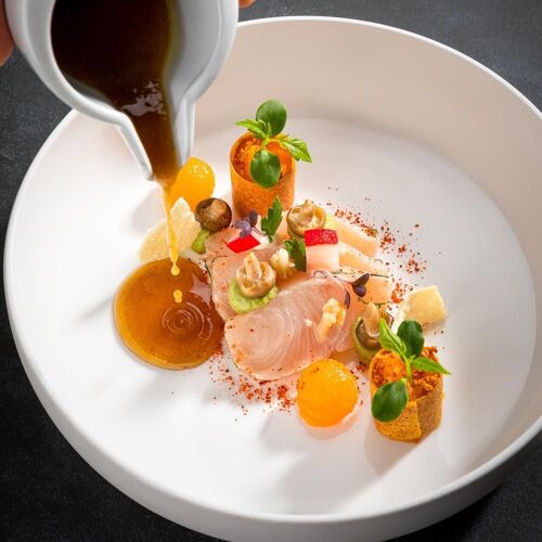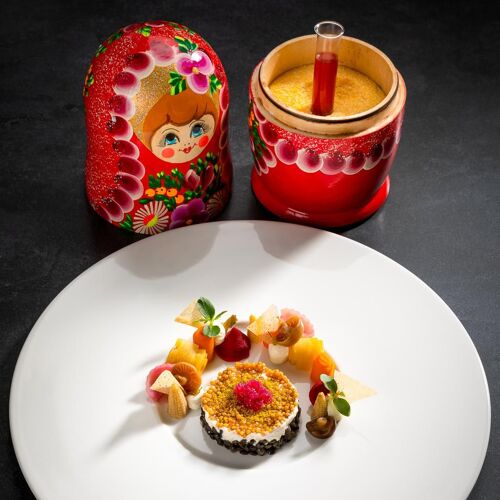 Es ist schon eine ganz besondere kulinarische Erfahrung, die das Küchenchef-Duo Alexander Wulf und Marcel Kokot Ihnen hier bietet: russische Gerichte, sehr modern und aromareich umgesetzt. Begleitet wird das Menü von dem tollen, fachlich versierten und legeren jungen Team um Sommelier Ronny Schreiber - als echter Weinkenner überrascht er mit interessanten, nicht immer alltäglichen Weinempfehlungen. Im Sommer wird das puristisch-schicke Restaurant um eine schöne Terrasse ergänzt. Tipp: Wenn Sie an der Theke zur offenen Küche speisen, sind Ihnen interessante Einblicke gewiss. Zudem bekommt man auch per Bildschirm einen Eindruck vom Geschehen am Küchenpass. Der russische Name "Troyka" bedeutet übrigens "Dreigespann" und nimmt Bezug auf das bestens eingespielte Betreiber-Trio Wulf/Kokot/Schreiber, das hier mit viel Enthusiasmus bei der Sache ist. Alternativ zum Gourmetmenü gibt es auch ein einfacheres Bistro-Angebot.