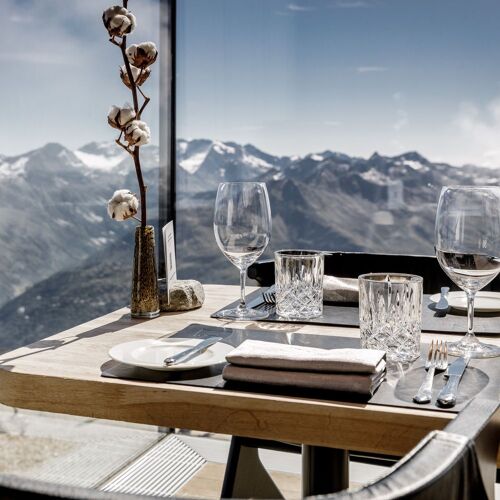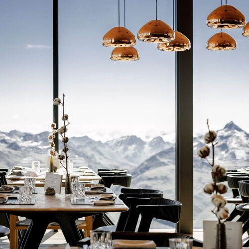 Neben seinem klaren Design begeistert der große Glaskubus mit einem fanstatischen Panoramablick auf die Berge. Im EG befindet sich das Restaurant, das ein modernes Degustationsmenü (auch vegetarisch) sowie eine eher klassische A-la-carte-Auswahl mit Gerichten wie Rinderconsommé, Wiener Schnitzel oder Rib-Eye-Steak bietet. Umsorgt wird man freundlich und aufmerksam. Alternativ serviert man in der Lounge im obersten Stock Tapas. Draußen locken angenehme Terrassen. In Sachen Wein verdient der "PINO 3000" Beachtung - er ist in dieser Höhenlage gereift! Daneben bietet die gut sortierte Weinkarte auch eine schöne Auswahl an Weine im Offenausschank. Die tolle Location diente übrigens auch als Drehort für den James-Bond-Film "SPECTRE". Direkt beim Restaurant gibt es das Museum „007 Elements“ – ein Besuch lohnt sich!