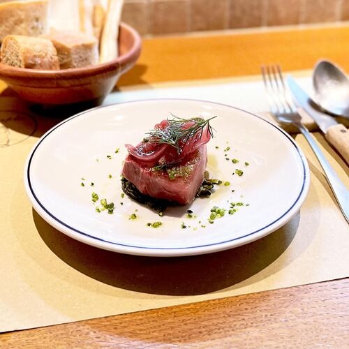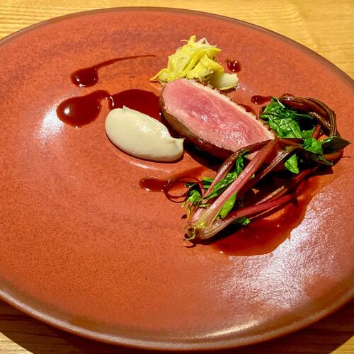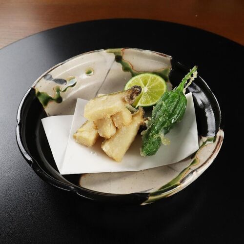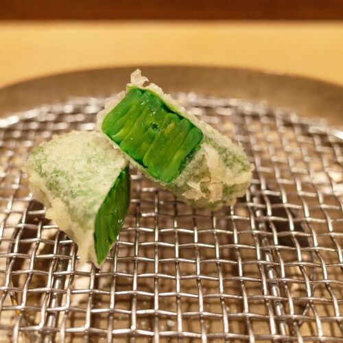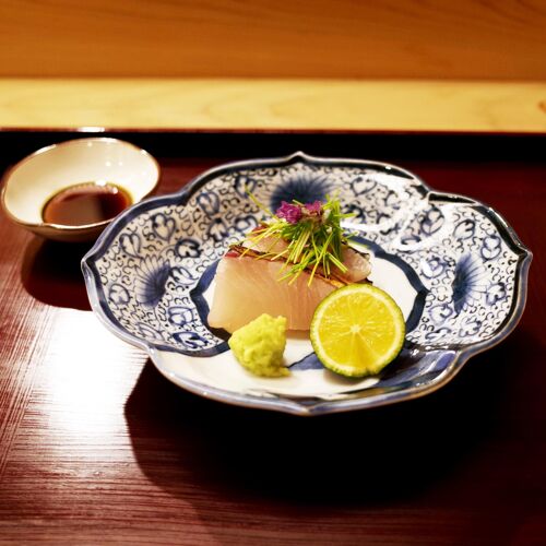 A wabi-inspired atmosphere, reminiscent of a traditional tearoom. A traditional cook stove mounted in the kitchen affords a view of the chef’s handiwork with charcoal brazier and broad-brimmed pot for cooking rice. The smoky scent of snacks from the brazier fills the air, while rice from the chef’s native Nagano cooks in the pot. Nigirizushi hews close to tradition, with white-fleshed fish, tuna, gizzard shad, shrimp, sea urchin and conger eel forming the core lineup. Three tuna pieces follow in succession—medium-fatty tuna seasoned in salt, soy-sauce marinated tuna, and rich fatty underbelly tuna—displaying a distinctive flair. Sushi rice enlivened with salt and vinegar keeps the sake going down smooth.
