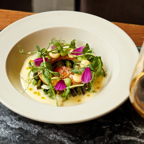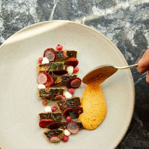 The cooking at Portland respects the principles of sourcing and seasonality; in fact, the menu is often reprinted after lunch as ingredients are used up and replaced by different ones. The kitchen believes in doing as little as possible to the raw ingredients to allow their natural flavours to come through, and dishes are never over-crowded, with every component there to enhance another – like bone marrow sauce used to add depth and richness to a venison Wellington. The pared-down look of the room matches the understated food.