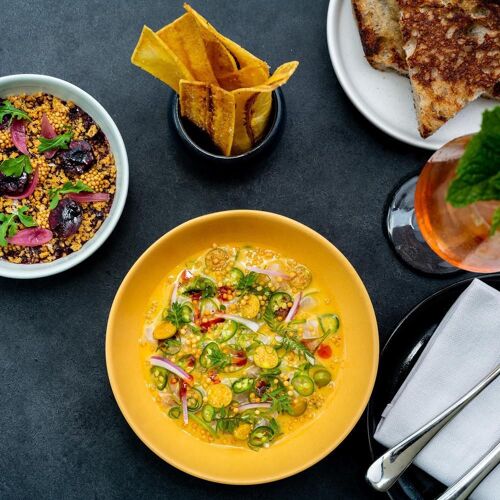 The evolving menu draws from seasonal local produce and Latin American, Asian and European influences with Chef Garcia's distinctive Angeleño point of view. Begin with a refreshing aguachile, where firm cubes of hiramasa are paired perfectly with melon, cucumber and fiery serrano chili. Then, a terra-cotta pot arrives brimming with shredded braised oxtail and beans atop a masa-based "spaetzle." The deconstructed strawberry shortcake with hibiscus-flavored angel food cake and strawberry ice cream ends things on a sweet note.