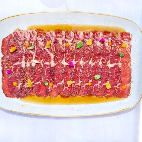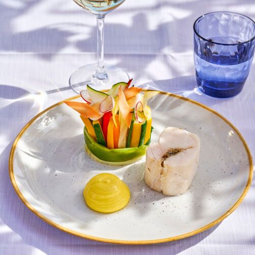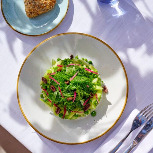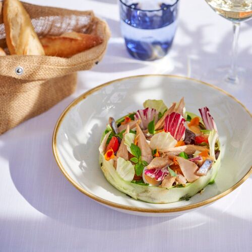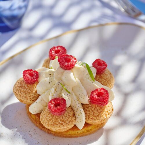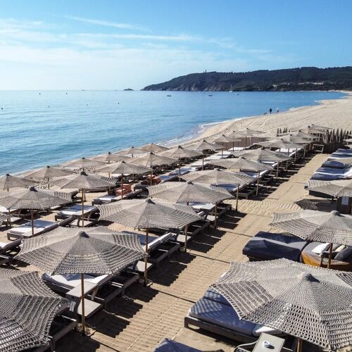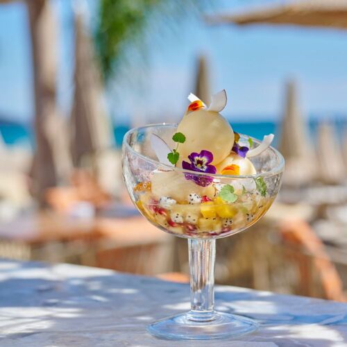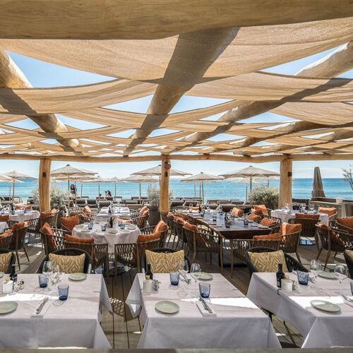 Sur la plage de Pampelonne, pensée dans une perspective durable, ce bibelot brillant tout de bois sablé et de coton n'est pas réservé aux seules bimbos ! Au programme : de délicieux poissons, des viandes grillées au feu de bois et des pâtes très prisées – à déguster les pieds dans le sable, face à la mer... sous le soleil exactement.