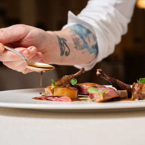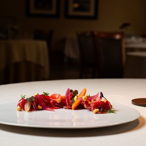An elegant dining room, with large windows and classic furnishings, creates a comfortable atmosphere from another era. The cuisine, on the other hand, is quietly modern and Mediterranean in style, alternating seafood dishes – such as amberjack marinated with curry, coconut, and beet – with meat offerings – such as partridge cooked on the bone with smoked parsnip, date stuffed with its liver, and mustard sauce.