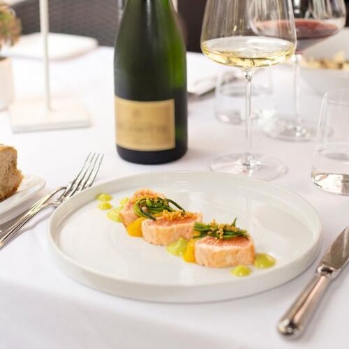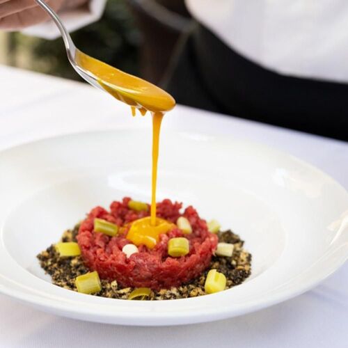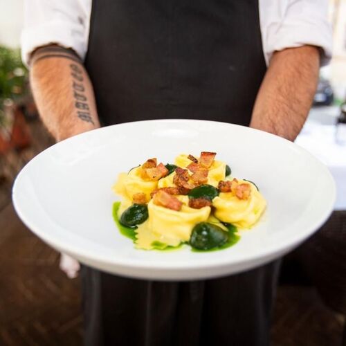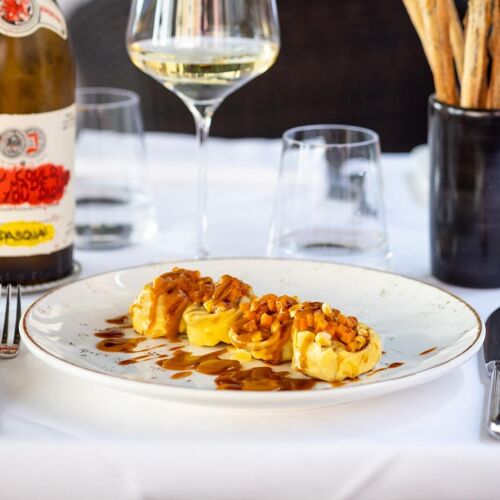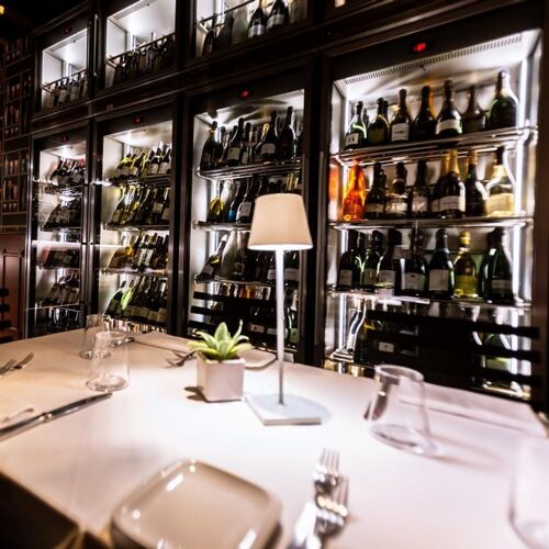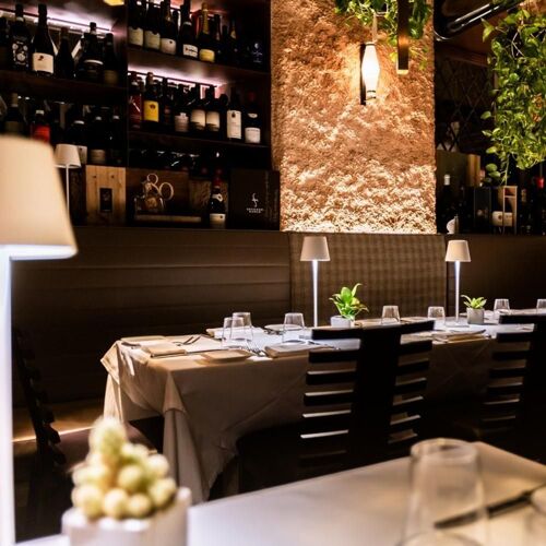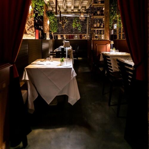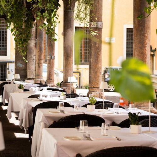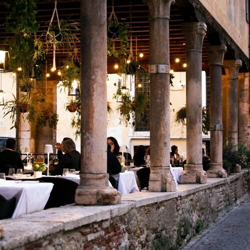 All'interno di una corte un po' defilata ma comunque centralissima si svolge il servizio estivo, mentre internamente il locale è intimo, con pochi posti, tavolini quadrati apparecchiati in modo classico, luci soffuse e belle decorazioni che omaggiano il mondo del vino. Cucina generosa che esce dai cliché più classici e turistici con ingredienti che seguono la stagionalità dei prodotti ed elaborazioni improntate a una certa creatività.