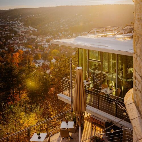 The restaurant close to the observation tower, also known as the Balcony of Jena, serves regional cuisine and offers a fantastic view over the city. Three individual rooms are available: country, Art Deco or honeymoon.