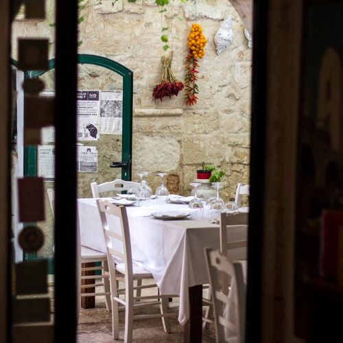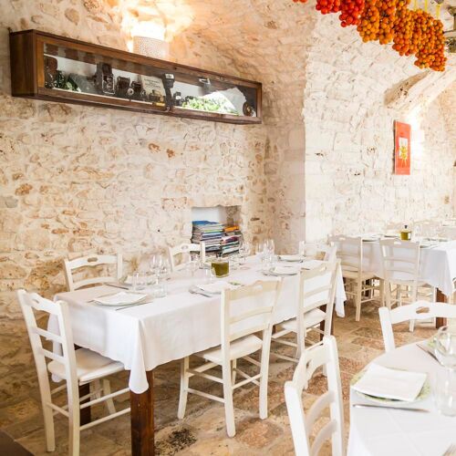 Situated amid the alleyways of the historic centre, this restaurant boasts a typical atmosphere with a barrel-vaulted ceiling and internal courtyard, with tables arranged under the arcades. The cuisine focuses on carefully chosen ingredients and recipes from Puglia, making the restaurant a must if you’re visiting the region. Booking in advance is highly recommended.