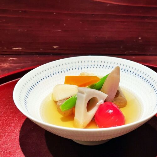 This counter-style restaurant hangs out its shingle in a corner of the roundabout in front of the north entrance to Ogikubo Station. Chef Kotaro Tachibana bases the menu around vegetables, showcasing the depth of Japanese cuisine. Takiawase highlight the ever-changing faces of nature, with colourful vegetables that cool you in summer and warm you in winter. Appetiser platters arrayed with salad with mashed tofu dressing, seasoned boiled greens and vegetables dressed with sesame sauce calm the soul still further with their savoury flavours.
