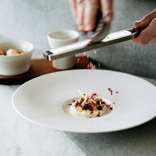 To say that Sanne and Jeroen Achtien have breathed new life into this institution would be an understatement. The beautiful manor has undergone a drastic makeover that has resulted in a luxurious and trendy space with a lounge feel – the curved seats create a sense of intimacy. The light and airy extension looks out onto the magnificent garden. After the appetisers, you can take a walk past the kitchen to see the impressive team in action and enjoy an additional dish. Chef Achtien draws on his Frisian heritage, the finest ingredients from his Zeeland surroundings and the experience he gained in Switzerland. His creative cooking is grounded in expertise, occasionally complex and highly exuberant. His care and respect for his ingredients shines through in the rich terrine crafted from the leftover pieces of cod and turbot. This is an excellent example of fin-to-gill cooking. He crowns perfectly poached fillets of North Sea sole, for instance, with an elegant potato cylinder filled with Zeeland mussels. A medley of crunchy vegetables is mingled with subtly briny razor clams, cockles, oyster and herbs. A mousseline enriched with dashi brings vibrancy, a velvety potato purée completes this generous ode to Zeeland's terroir. Perfectly complemented by an expertly chosen glass of wine…