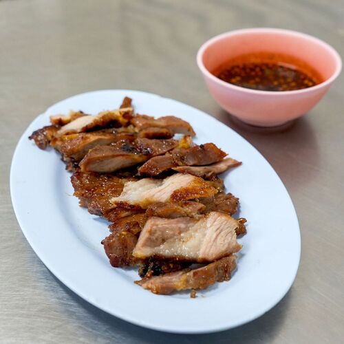 ร้านรถเข็นเล็กๆ ที่ห้ามพลาดจริงๆ สำหรับคนชอบเมนูคอหมูย่าง เปิดบริการมากว่าสิบปีแล้ว ทุกคืนจะแน่นไปด้วยลูกค้าทั้งขาประจำและขาจร เมนูเด็ดที่แนะนำคือคอหมูย่างราดข้าว เนื้อหมูย่างได้นุ่มหอมและฉ่ำ รสเค็มหวานพอดีจากเครื่องหมัก เข้ากันดีมากกับน้ำจิ้มแจ่ว ส่วนเมนูอื่นๆ อย่างลาบ น้ำตก ต้มยำ นั้นก็อร่อยไม่แพ้กัน