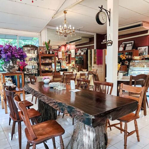 ร้านบรรยากาศอบอุ่นท่ามกลางแมกไม้ร่มรื่น แบ่งพื้นที่ออกเป็นสองโซนให้เลือกสรร ทั้งห้องอาหารภายในที่ตกแต่งอย่างคลาสสิกด้วยเฟอร์นิเจอร์วินเทจ โคมระย้า โคมไฟตั้งพื้น และนาฬิกาโบราณ หรือจะเลือกนั่งกลางสวนเพื่อดื่มด่ำกับร่มเงาธรรมชาติก็ได้ อาหารไทยของที่นี่ปรุงรสกลมกล่อม ใช้ผักและสมุนไพรสดจากสวนของร้านเอง ไม่ว่าจะเป็นใบชะพลู ผักชี หรือโหระพา อีกทั้งยังมีเมนูสร้างสรรค์เฉพาะตัวของเชฟ หนึ่งในจานแนะนำคือ ถั่วเข็มผัดกะปิกุ้ง ที่หอมเข้มข้น กลมกล่อม และน่าลิ้มลอง