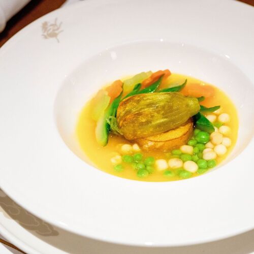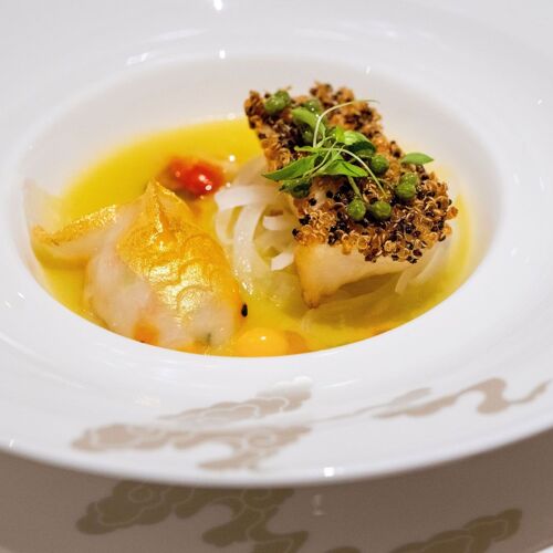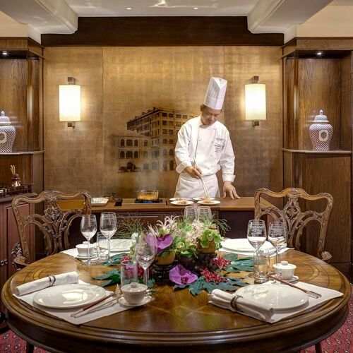 The room, spread over two levels, evokes old-Shanghai circa 1920s – stained glass windows, teak floors and rugs all speak of the golden era. On the menu, however, classics are showcased side by side with novel creations such as scrambled egg white with lobster and crabmeat, and dishes garnished with edible flowers that taste of spring. Dim sum at lunch is also recommended, to be enjoyed with your choice of tea from 30 varieties.