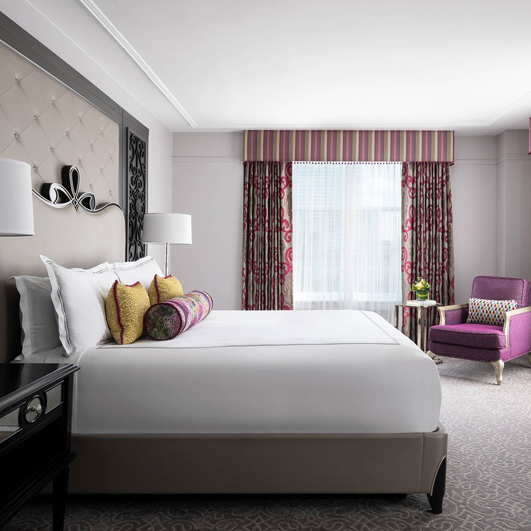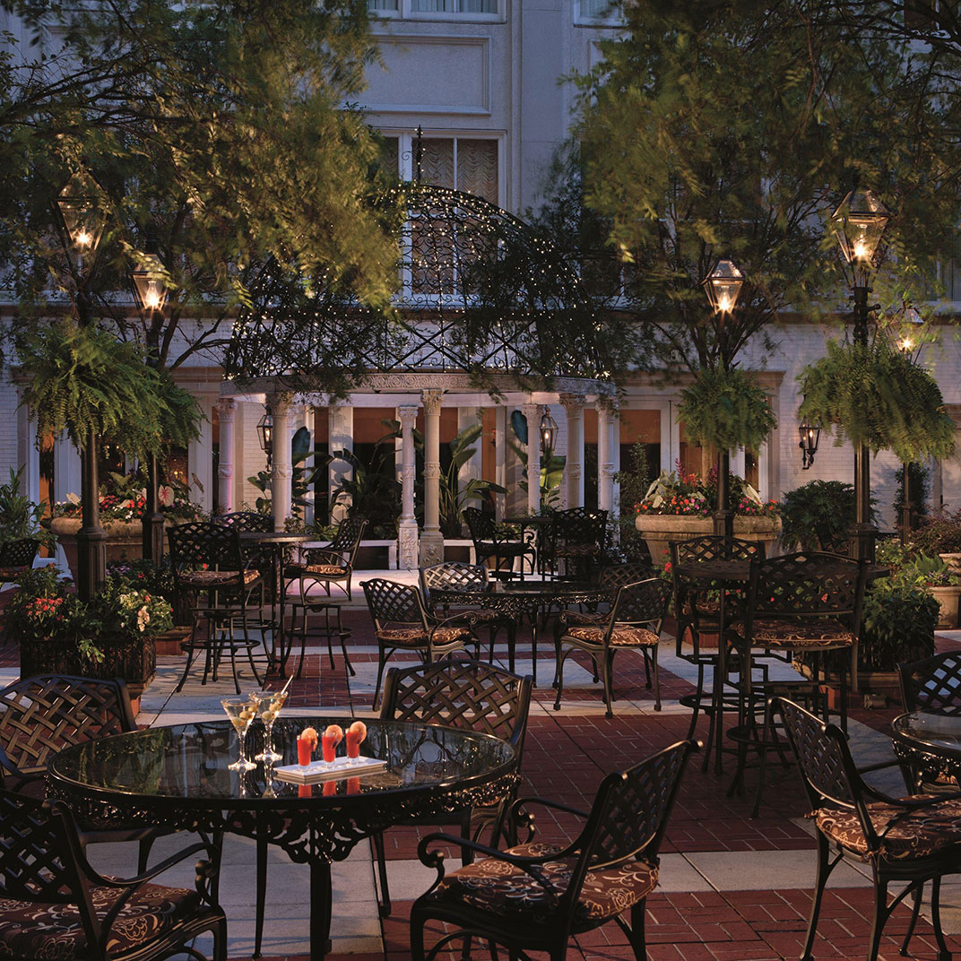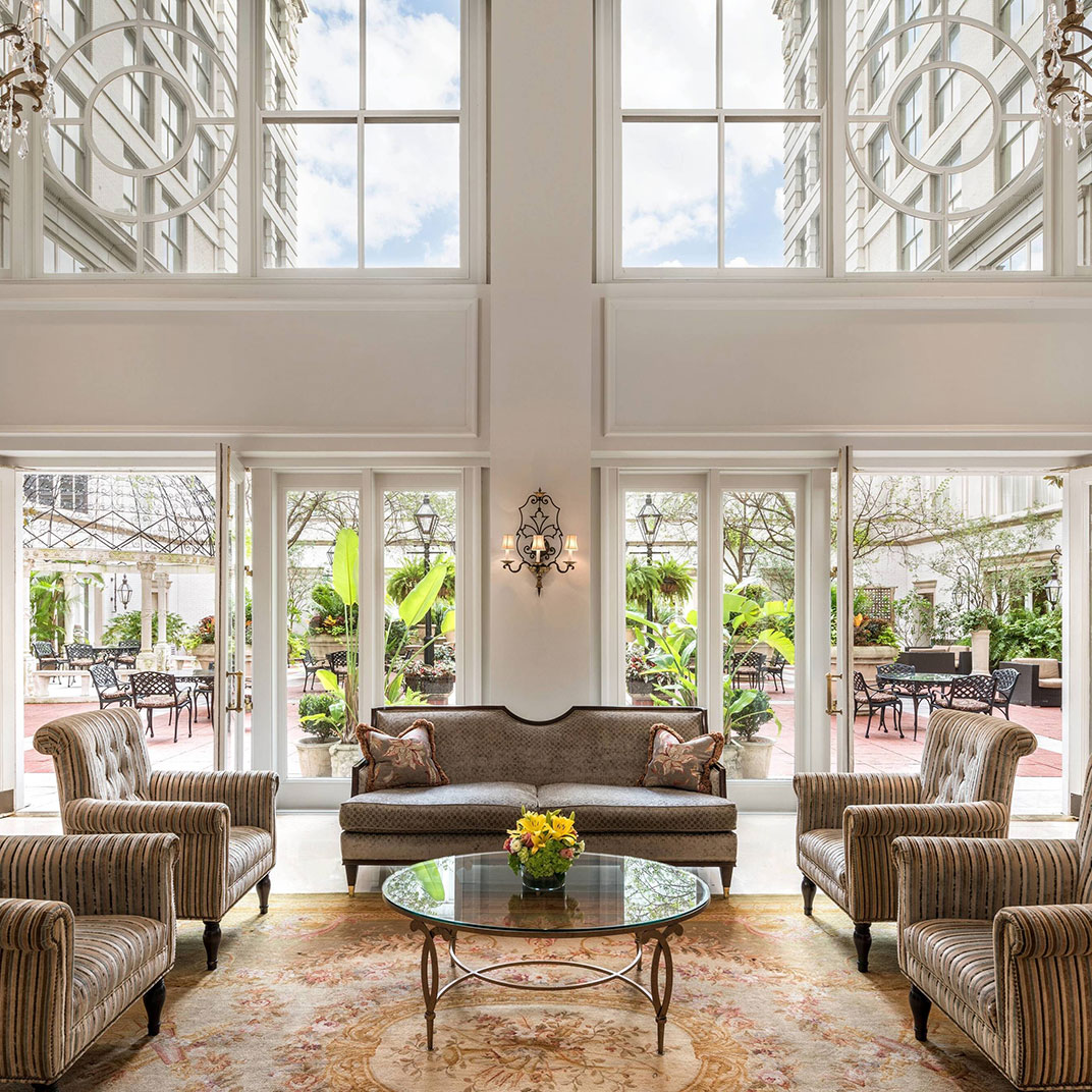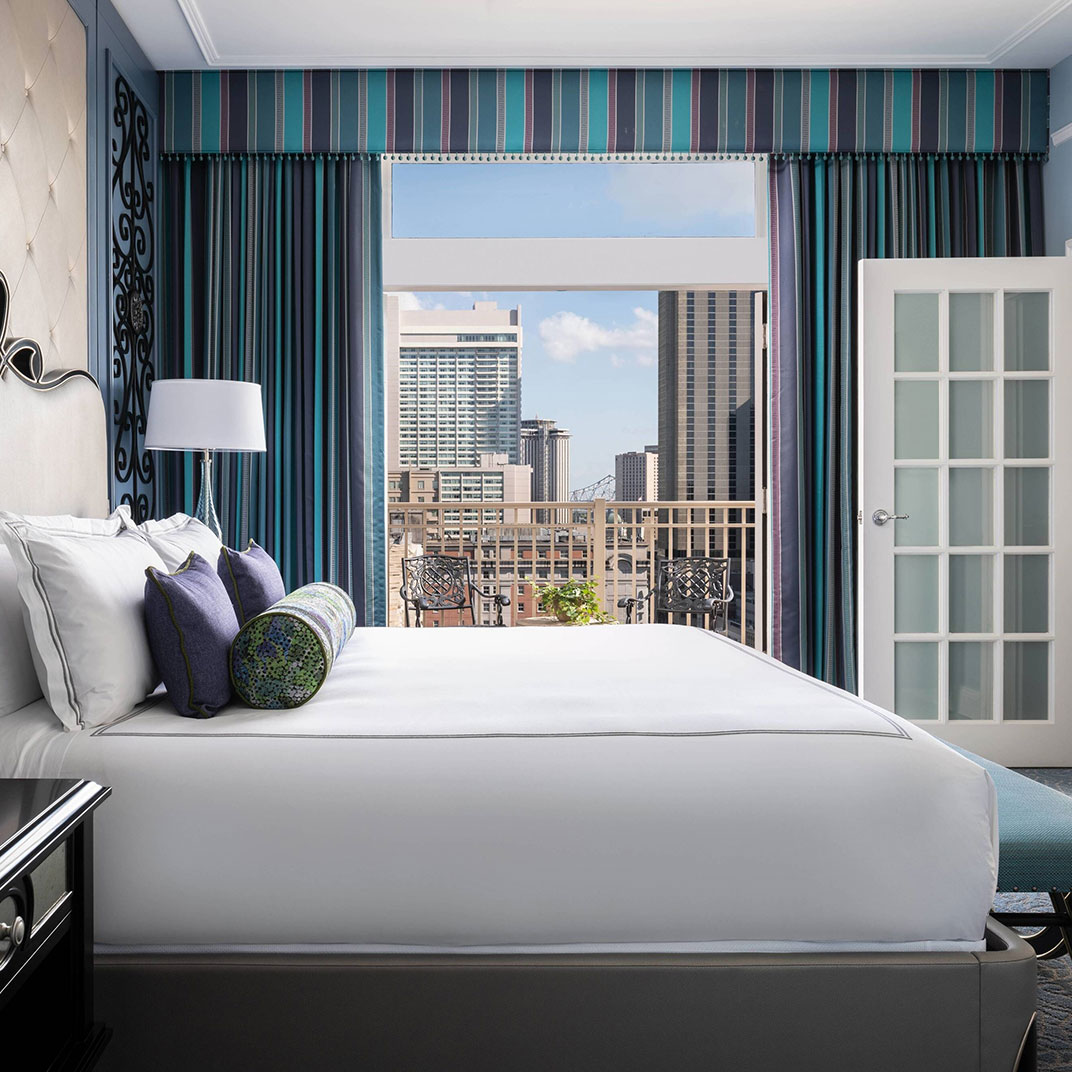 Occupying a plum spot on Canal Street in the French Quarter, the hotel resembles one of the Garden District’s mansions from the outside, and works hard to emulate the same grandeur throughout the spacious interiors. High ceilings, fresh bouquets, and rosy-hued overstuffed furniture characterize the lobby and ballrooms. The design is far from cutting-edge or contemporary; rather, the public spaces seem fit to host a traditional wedding reception at any hour of the day. The hotel’s high standards and various luxuries, however, are above reproach, from expected amenities like feather beds, marble baths, afternoon tea, and turndown service to pleasing extras like rainforest showerheads, Bulgari White Tea bath products, pet-friendly provisions, and no fewer than four upscale restaurants onsite.