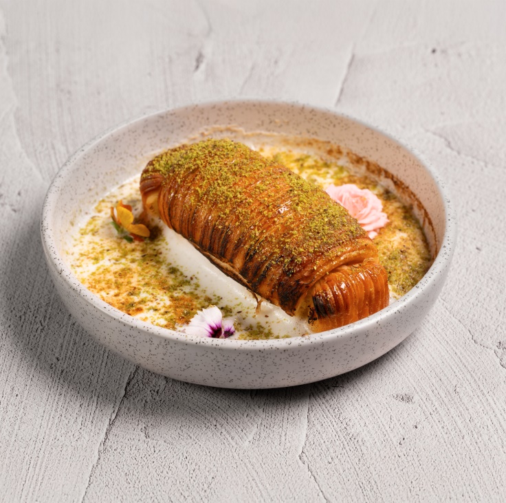 The Um Ali at ťazal is a special milk pudding with a flaky pastry at the center. Image credit: The MICHELIN Guide