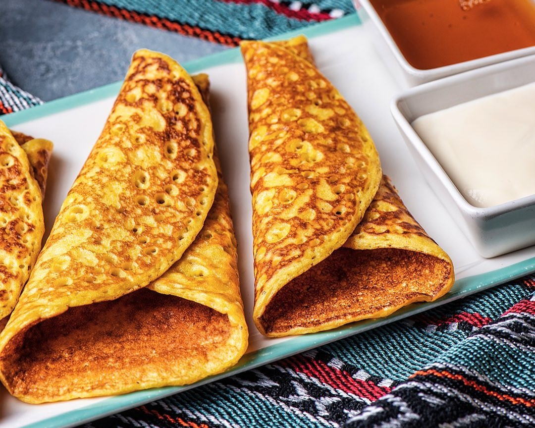 A nod to its smooth, flowable batter that’s thicker than a crêpe but lighter than a traditional pancake. Made with yeast, sugar, eggs, and a blend of saffron and cardamom, it has a warm, subtly sweet, and slightly spiced flavor that makes it unmistakably Emirati. For a final indulgent flourish, it’s brushed with butter or ghee just before serving.