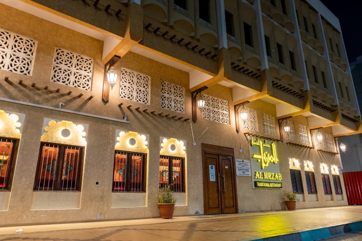 Another spot to enjoy this iconic dish is Bib Gourmand Al Mrzab. Situated on Abu Dhabi’s prominent Airport Road, this traditional restaurant is almost always a full house, renowned for its flavorful and spicy homemade meals. From the outside, the diner is hard to miss, thanks to its glowing neon sign, while inside, it has a home-like feel, offering an array of private cabins, majlis, and conventional tables surrounded by frames of old Abu Dhabi.