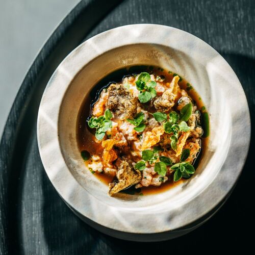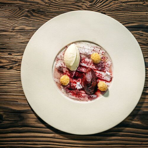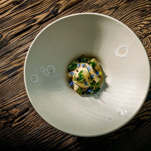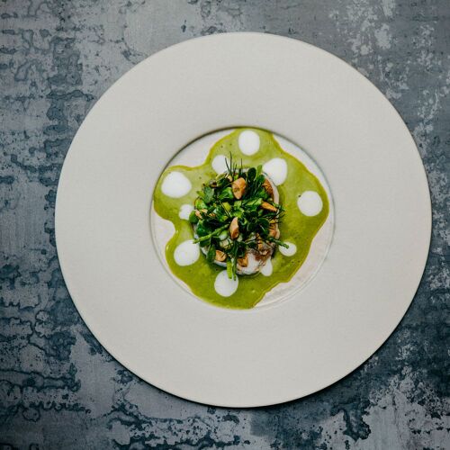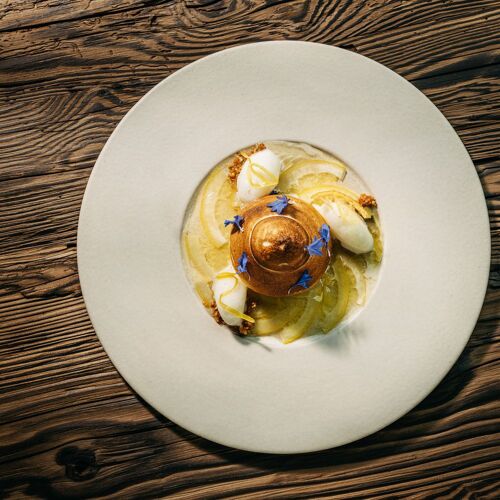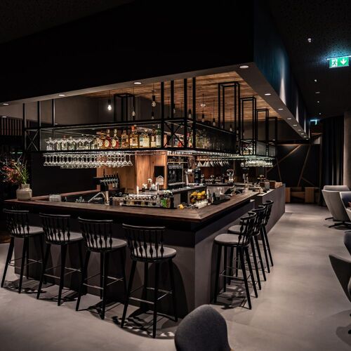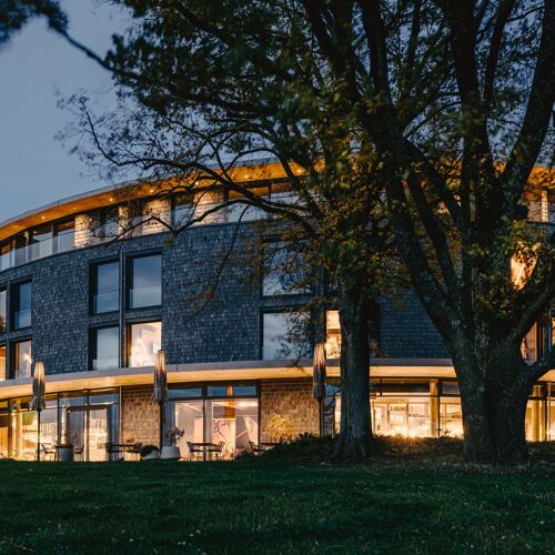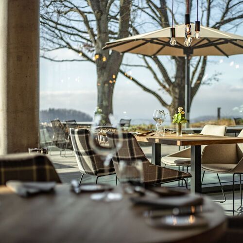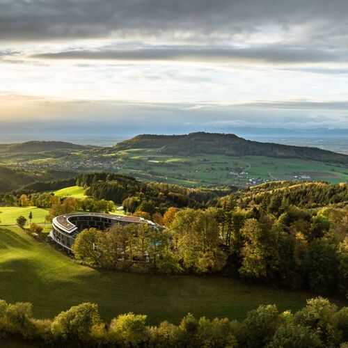 The beautiful landscape here is perfectly complemented by the elliptical shape of Luisenhöhe wellness and health resort, which gracefully blends into its surroundings. Inside, too, modern design and high-quality natural materials make for an attractive decor that pays homage to the region – that goes for the guestrooms, the spa and the restaurant. The latter has a pleasantly laid-back feel, and floor-to-ceiling windows look out over the Black Forest and the Schauinsland mountain – only the view from the fabulous terrace can beat it. Prepared in the open kitchen, the four-course vegetarian set menu can be supplemented with a fish or meat dish, or veganised. The emphasis on regional sourcing and top-quality ingredients is demonstrated by compositions such as "sunflower seeds/zucchini/tarragon + pasture-raised chicken from the Black Forest". The excellent wine list features a good selection of German and international labels. The futuristic design of the passage that leads from the multi-storey car park to the hotel is also impressive.