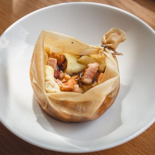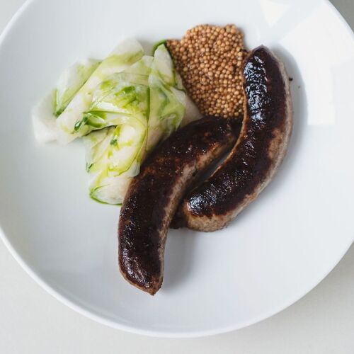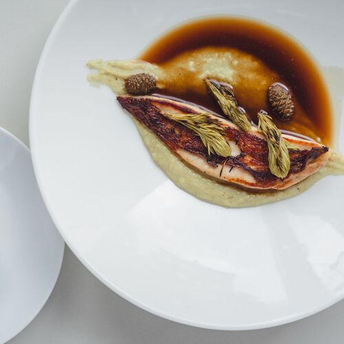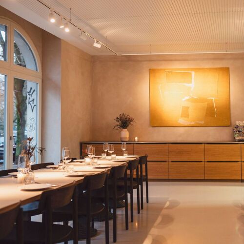 Merold promises "new German cuisine" – top-notch regional ingredients from Berlin and Brandenburg served in the form of dishes such as "braised onion, buckwheat, black garlic" or "guinea fowl 'Backhendl', mashed potatoes, truffle remoulade". The dishes are often pared back to just a few components, which are perfectly prepared and combined. As a kind of signature dish, and an absolute must, the house-made bratwurst changes on a monthly basis, for instance, beef, sauerkraut and house-made doubanjiang. You can choose à la carte or opt for the four- or five-course set menu – with the fantastic bratwurst as an optional add-on. Their wine list is also well-stocked. The sleek modern interior is inviting, and the service is attentive, knowledgeable and agreeably relaxed. Chef-patron Jonas Merold himself frequently puts in an appearance front of house to greet diners and introduce his creations.