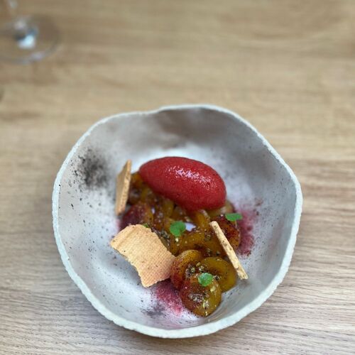 This quintessentially cosmopolitan, downtown eatery of Beaune is the joint brainchild of Tatenda Mhende, in charge of the dining room, who hails from Zimbabwe, chef Natasha Watson, who is from Calgary (Canada) and Marc Marchetti, also a chef, who is a Beaujolais lad. This alchemy of buddies has sparked a particularly appetising culinary offering that is depicted by a concise menu of hearty dishes packed with punchy flavours, to be shared (or not!): barbecued oxheart tomatoes, smoked tomato water and mozzarella; crunchy fritters of mushrooms with marrow, chardonnay-flavoured vinegar gel; pork belly, patty pan squash and courgettes.