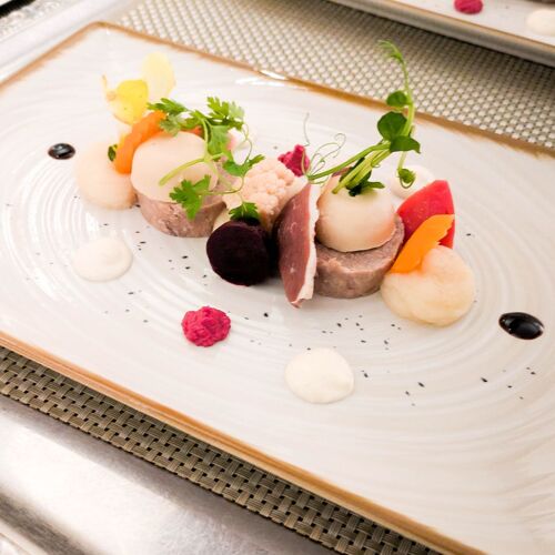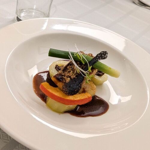 Both the decor (vaulted cellar, exposed stone and beams) and the food are full of character. Laurent Dufour draws on fine produce to create generous and authentic dishes, such as fillet of sea bream with Provencal-style vegetables and pesto, or roast pigeon with pan-fried foie gras and sherry jus. The menu changes regularly and, in winter, features truffles, of which the chef is a big fan! The welcome is cordial.
