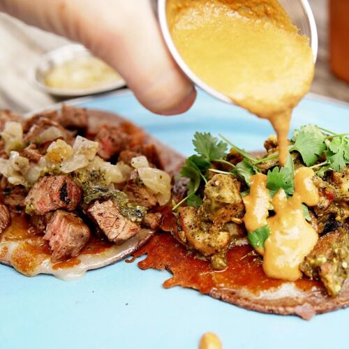 Nixtamalized corn tortillas arrive a beautiful shade of blue to tenderly fold around lip-smacking fillings—like the vegan elote tacos chock-full of sweet corn that's in turn tossed with peanut-chipotle aïoli, lime and chili. Other standouts include the star anise honey-glazed pork belly tacos, paired with crispy caramelized cheese and a halo of green onion; or the shredded, saucy short rib barbacoa version, piled high and crowned by a wedge of avocado and flutter of black sesame seeds.