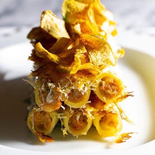 The Ohla Barcelona hotel’s fine-dining restaurant boasts an unmistakable appearance, due to the “eyes” or “ocular globes” designed by artist Frederic Amat that adorn its neo-Classical façade. Here, French chef Romain Fornell has introduced his new culinary vision that reinterprets concepts and recipes through cooking that features French-influenced Mediterranean cuisine, seasonal ingredients, identifiable flavours and astute pairings, plus a desire to involve guests in their dining experience. In addition to the different-sized tables in the dining room, you’ll find an open kitchen with bright and shiny copper pans hanging from the ceiling, plus a U-shaped chef’s table for 14 diners. Choose between several interesting tasting menus (Earth & Sea, Celebration and Vegetarian) and two slightly less expensive options at lunchtime. One of Caelis’ signature dishes and a definite must here is the delicious “Surf & Turf” cannelloni with lobster and foie gras.