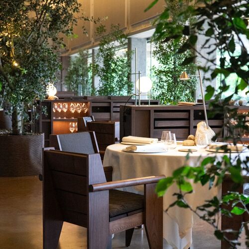 An old military fortress provides the backdrop for this Roca brothers venture, occupying the imposing Castillo de Sant Julià de Ramis, barely 10km from Girona, which they have transformed into a leading food and cultural centre. In this setting, which also features a superb hotel, everything makes an impression, from the access through the CCR exhibition explaining the creative processes of El Celler de Can Roca (CCR), to the impressive dome in the wine cellar (housing over 80 000 bottles), academy-library and the distillery that now acts as the restaurant’s R&D space. In the dining room, where the predominant materials are cement and concrete, the aim is to bring the surrounding natural landscapes into the heart of the room via the large picture windows. In terms of cuisine, the à la carte favours classic El Celler recipes, albeit with a twist that adds the eatery’s own personality. This is complemented by two highly original menus: Espíritu Salado (6 dishes and 2 desserts) and Espíritu Dulce (2 dishes and 6 desserts).