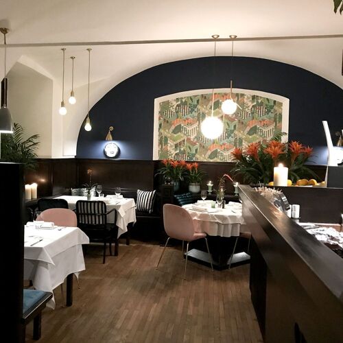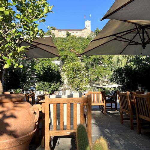 This restaurant’s excellent location is best appreciated in summer, with tables overlooking the river and charming views of the castle lit up at night. The dining room, personally designed by the chef with taste and sensitivity, is also attractive, boasting muted tones and an elegant and intimate ambience inspired by the early 20C. The cuisine is Mediterranean in style, with a focus on fish and seafood – the shellfish are excellent, as is the delicious grilled sea bass with buttered mashed potatoes. One of the house specialities (which must be booked in advance) is the lamb cooked in the wood-fired oven and served with seasonal vegetables – this dish alone makes the journey here worthwhile! The wine list focuses on Slovenian labels, which are also available by the glass.