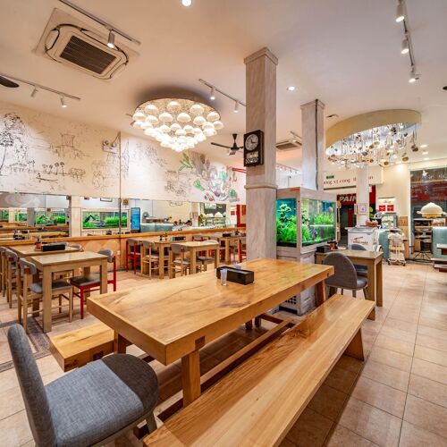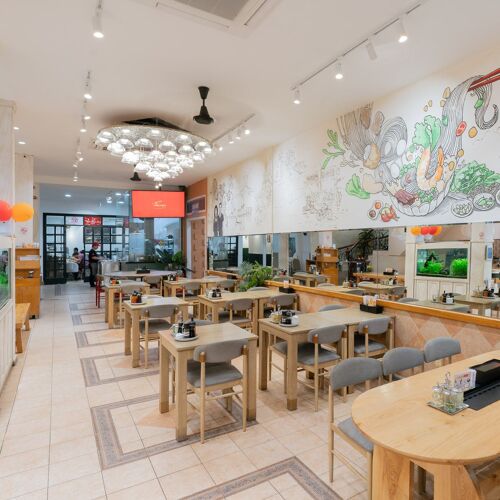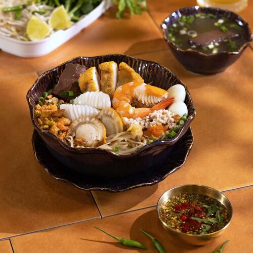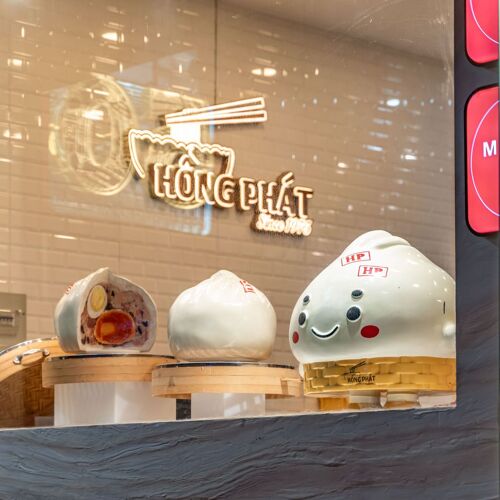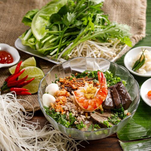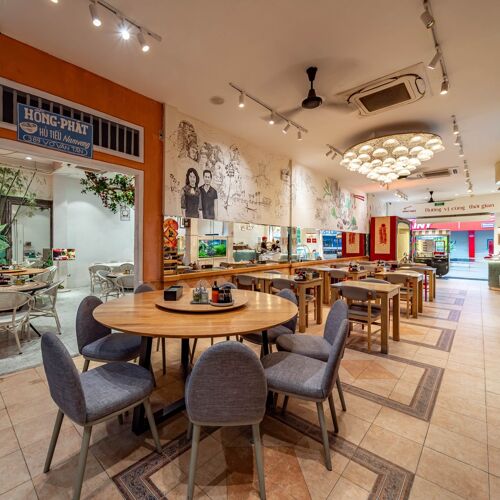 The meeting of Chaozhou and Khmer cultures gave rise to Hủ tiếu hồng phát noodles. The chả giò tôm cua (shrimp and crab spring rolls) and sủi cảo chiên (fried shrimp and pork dumplings) are great appetisers. The soft rice noodle soup comes with minced meat, liver, tiger shrimps or braised blood curd.