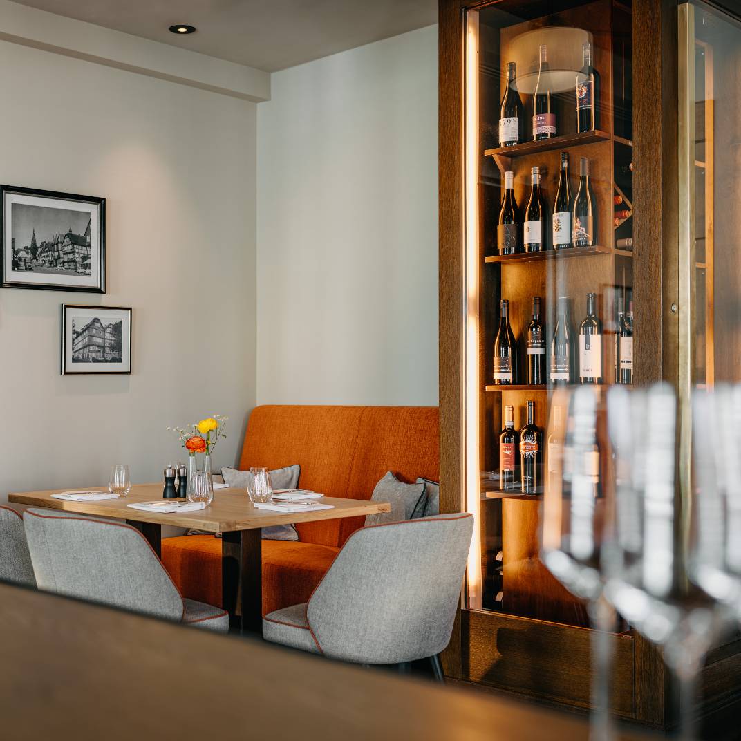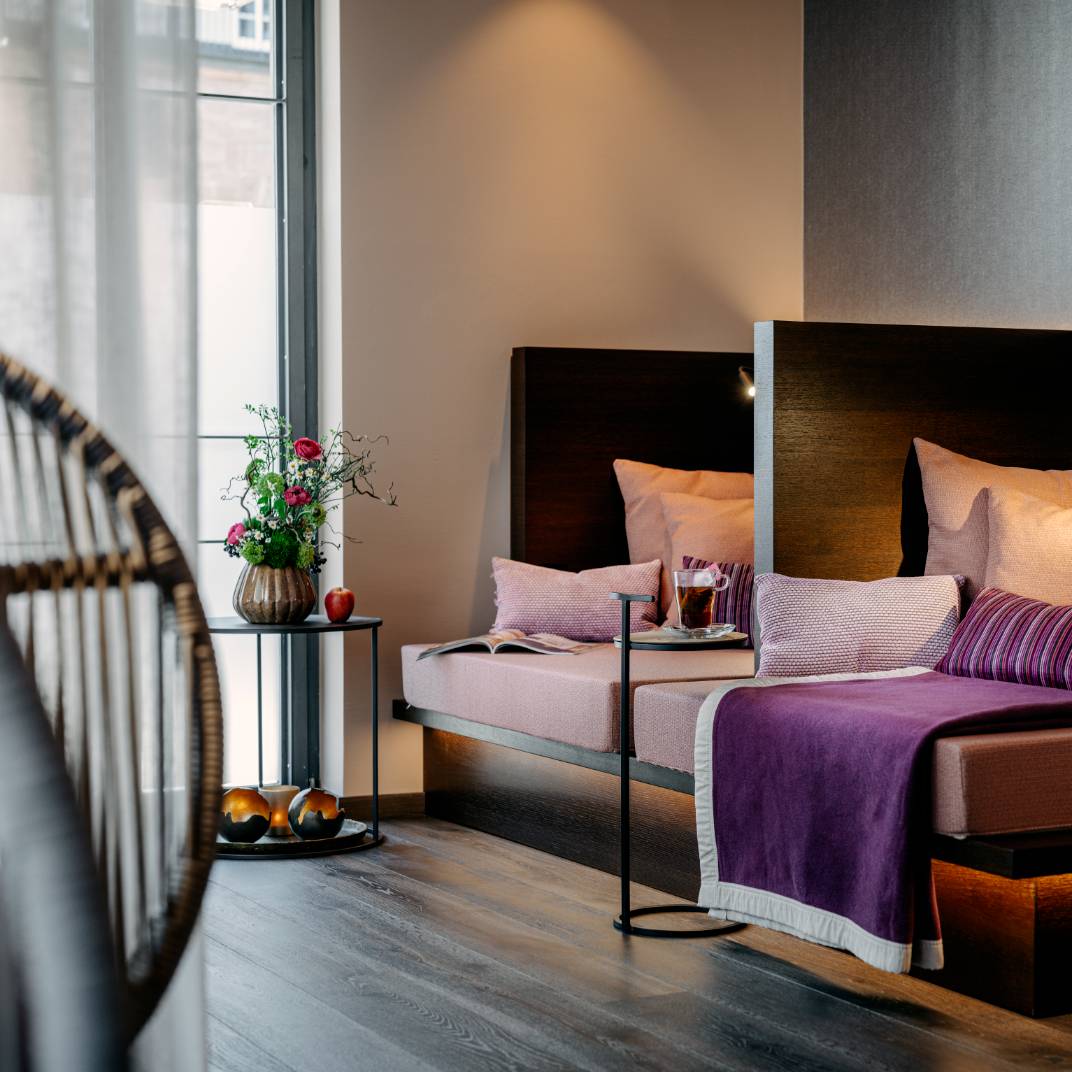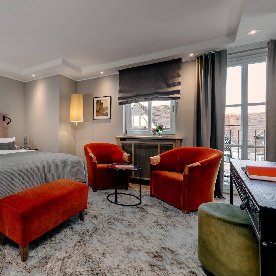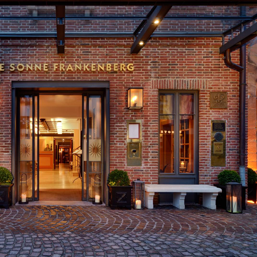 The coziest suites have exposed timber ceilings, separate living rooms, and spacious bathrooms with tubs. Slightly larger rooms feature four-poster beds, bay windows, and fireplaces, and the grandest suites are more like apartments, with fully equipped kitchens, dining rooms, and reading nooks. All of the hotel’s suites are sun-filled and quiet, and many have views over the market square below. In addition to its popular dining venues, Hotel Die Sonne Frankenberg also offers a few amenities exclusively for guests: an elegant breakfast room where a lavish buffet is served each morning, and the fireplace-warmed Philippo Lounge, named after the medieval sculptor who carved the town hall’s iconic wooden figures.