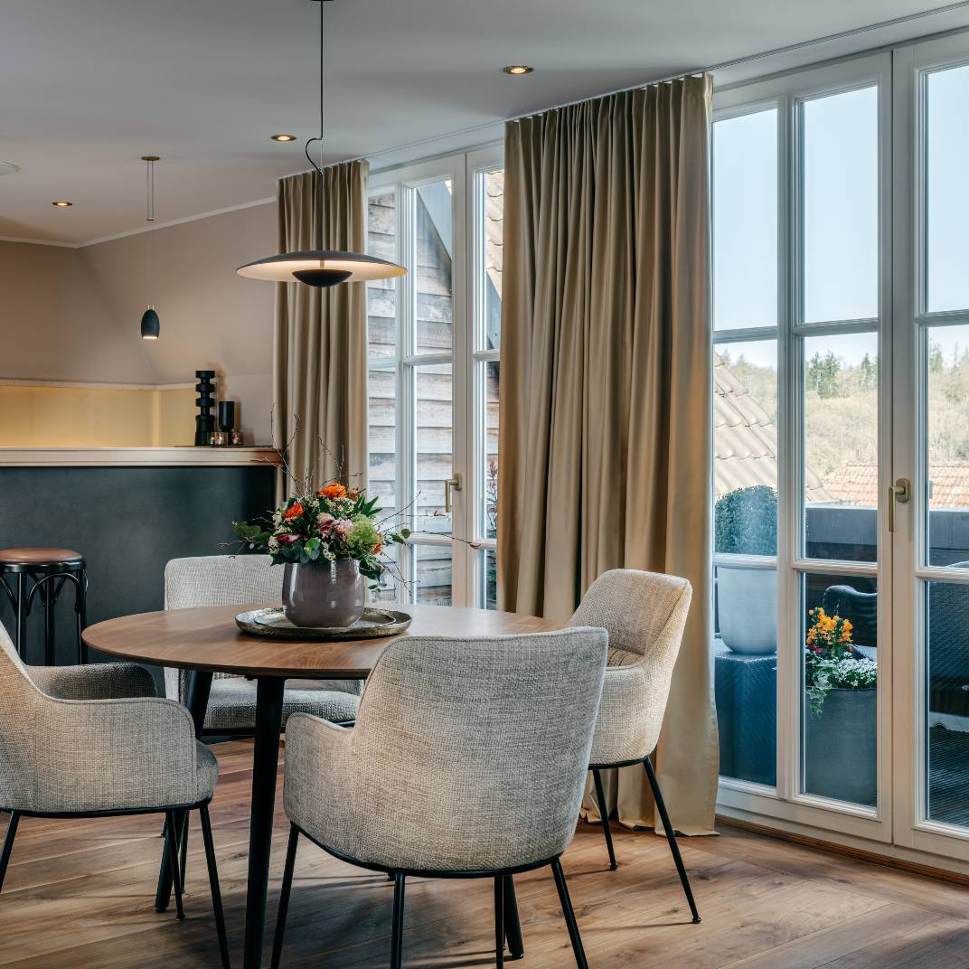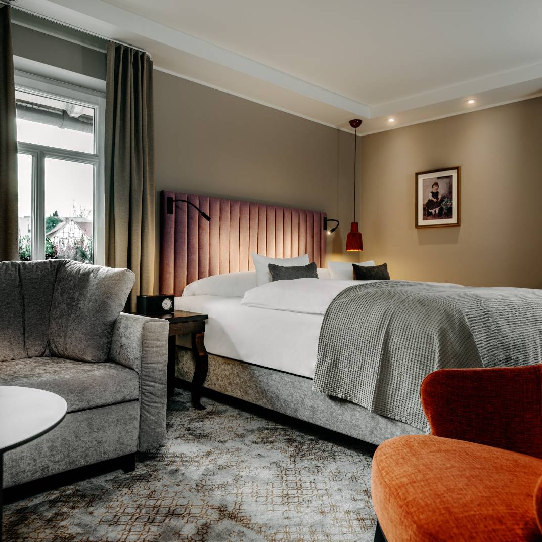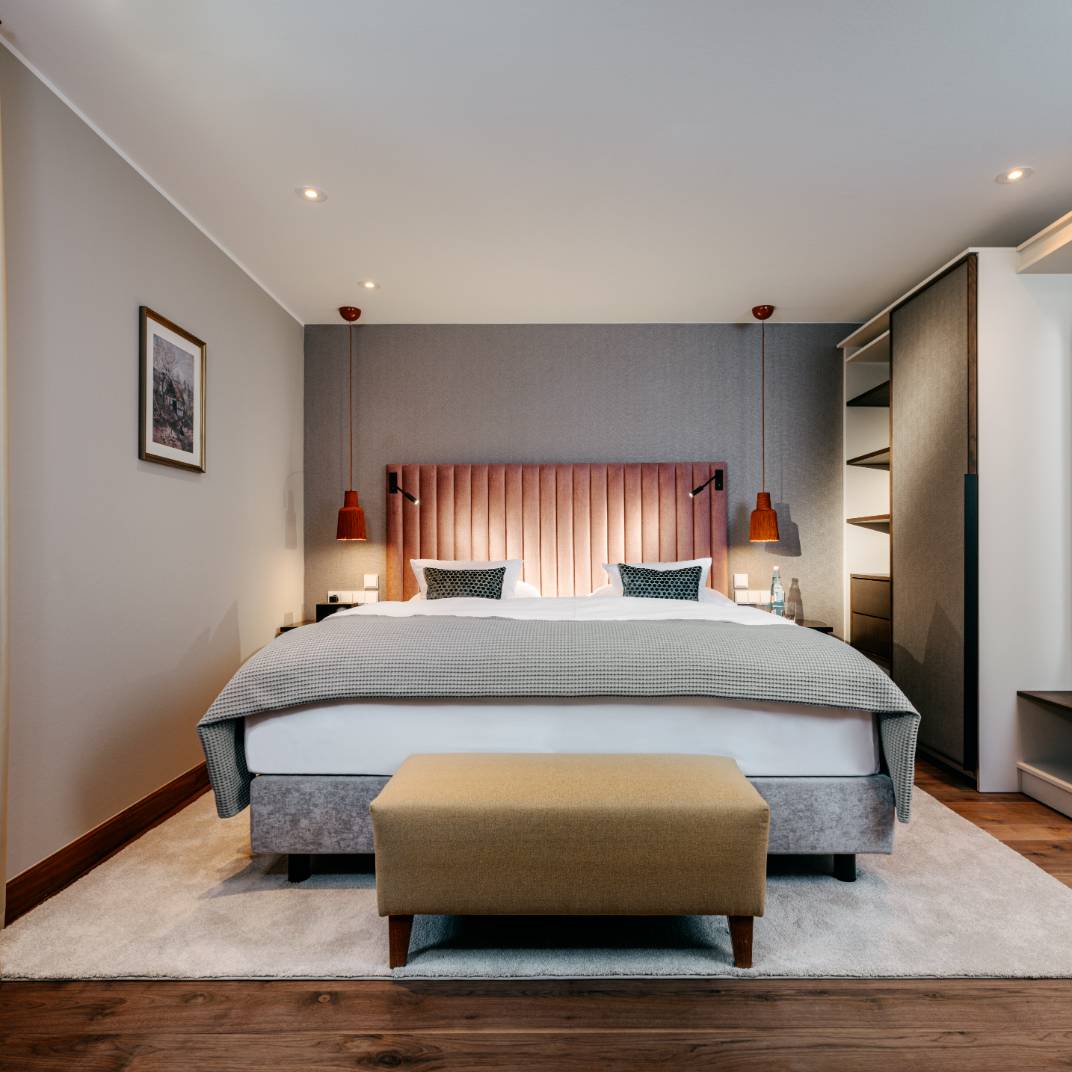 The coziest suites have exposed timber ceilings, separate living rooms, and spacious bathrooms with tubs. Slightly larger rooms feature four-poster beds, bay windows, and fireplaces, and the grandest suites are more like apartments, with fully equipped kitchens, dining rooms, and reading nooks. All of the hotel’s suites are sun-filled and quiet, and many have views over the market square below. In addition to its popular dining venues, Hotel Die Sonne Frankenberg also offers a few amenities exclusively for guests: an elegant breakfast room where a lavish buffet is served each morning, and the fireplace-warmed Philippo Lounge, named after the medieval sculptor who carved the town hall’s iconic wooden figures.
