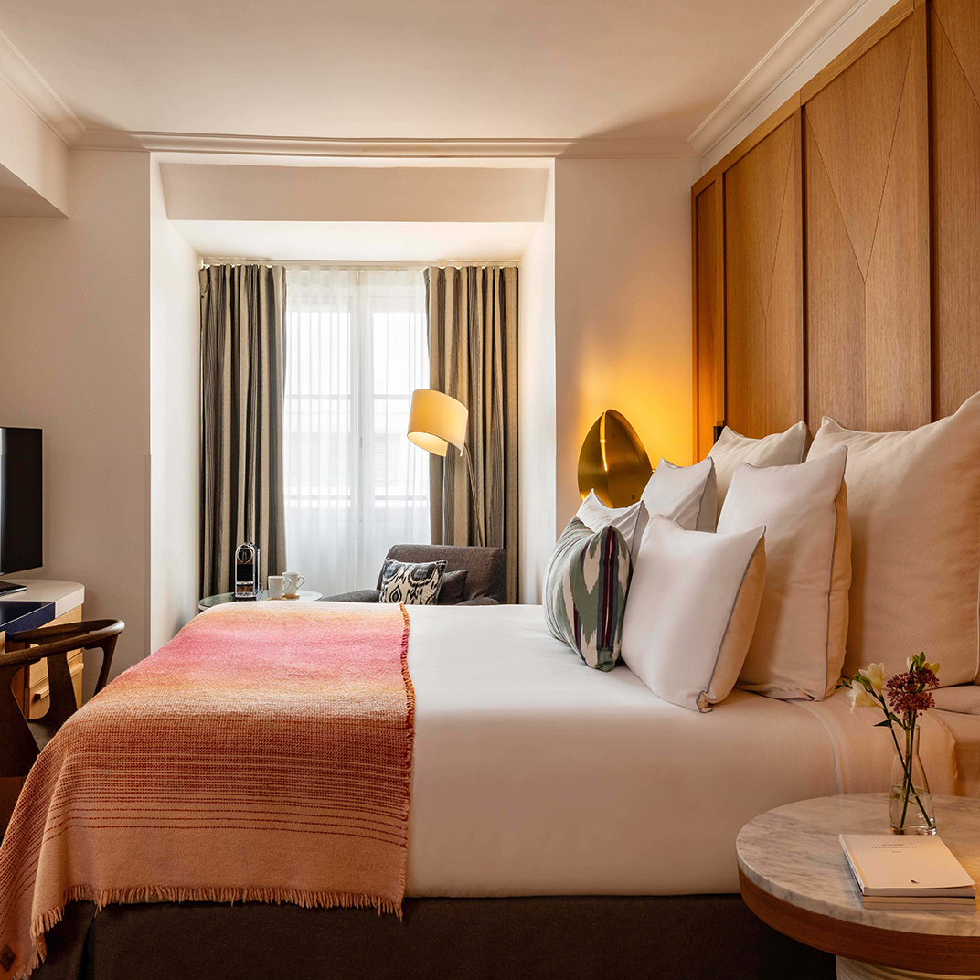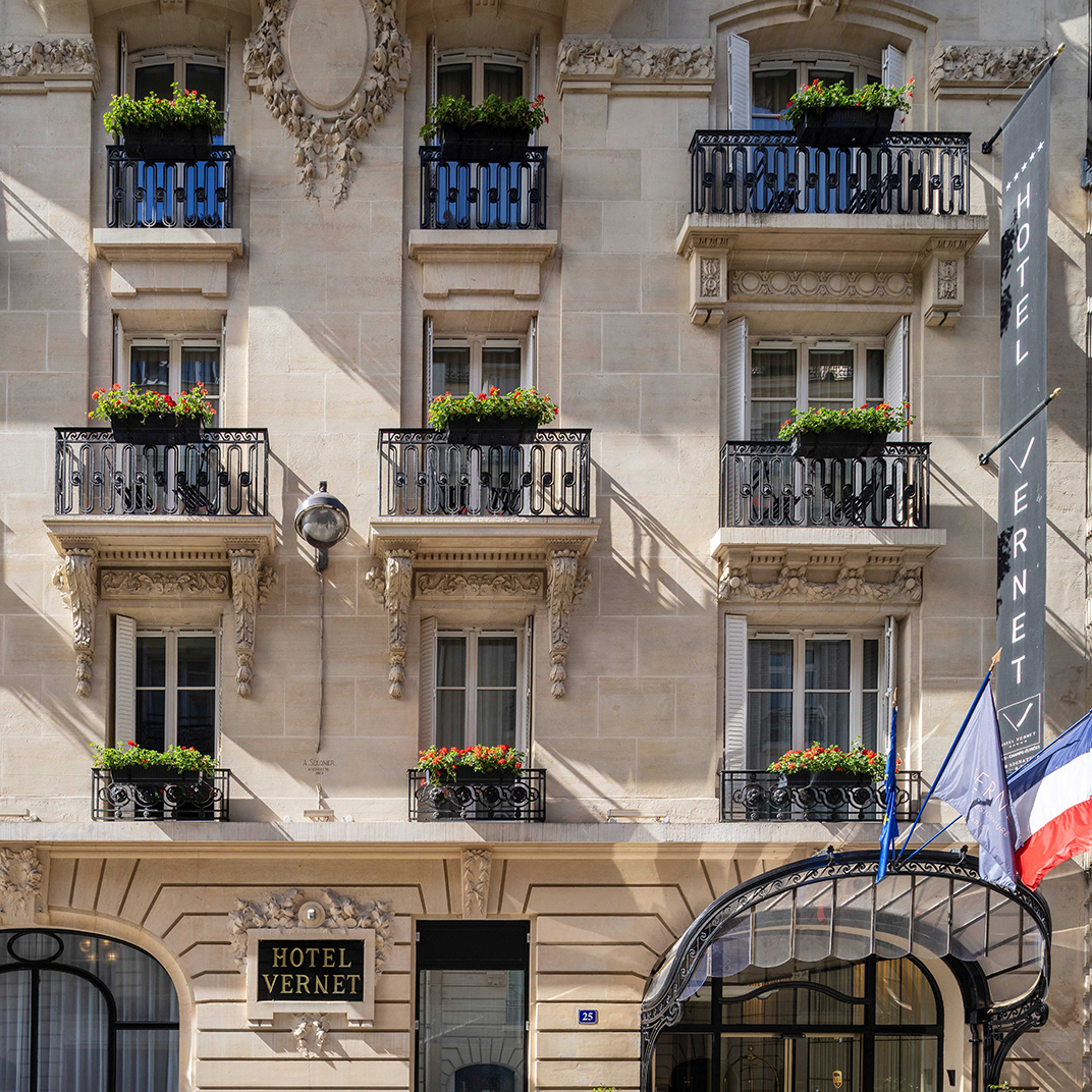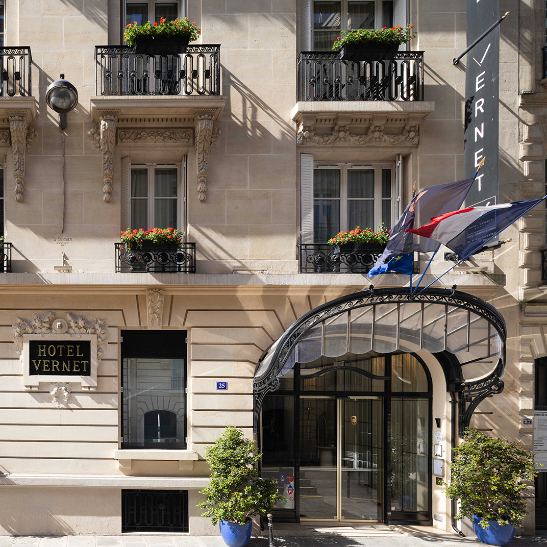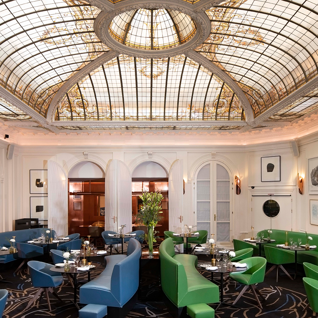 Sister hotel to the Left Bank’s Bel Ami, the Hôtel Vernet is blessed with a singular location: more or less right at the business end of the Golden Triangle, yards from the Arc de Triomphe itself, in a century-old post-Haussmann building by Albert Joseph Sélonier, with a glass dome designed by Gustave Eiffel himself.