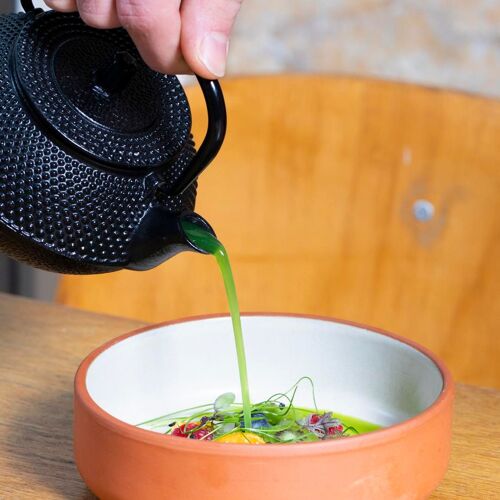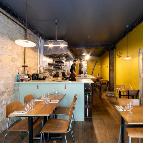 Exposed stone walls, visible electric cables and streamed music in the long, narrow dining space, and, at work in the open kitchen, Korean chef Jaywook Hur. Going solo in the kitchen, he can be seen cooking up modern, creative French cuisine with a few Asian touches (on this particular evening, they include tempura, sesame, kimchi), as his mystery menu unfolds: a surprising and beautifully fresh starter such as sea bass, kimchi and avocado, accompanied by raspberries and a quenelle of smoked herring roe; or the oh-so-tender matured Simmental sirloin, fennel, beetroot and its bold jus.