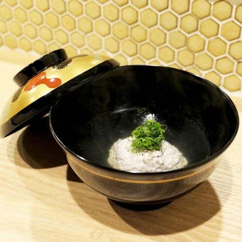 Light streams from a small sign in a Pontocho back alley. Inside the cozy interior popular tunes from the Showa era play, creating a pub atmosphere. The omakase set menu is a series of numerous small plates and bowls. Sushi of vinegared mackerel, simmered octopus and roast duck are products of izakaya training, while soups and char-grilled items bring kappo experience to bear. Grilled fish is paired with shuto (pickled and seasoned fish entrails) and konowata (salted sea cucumber entrails) paste, carefully chosen for their affinity with sake.