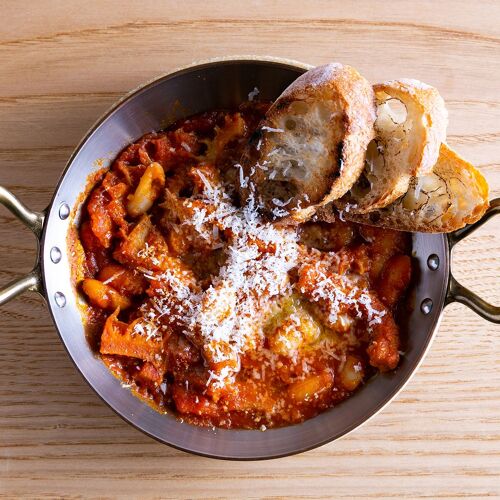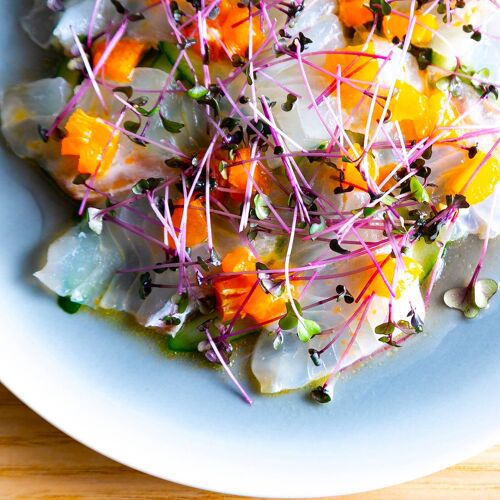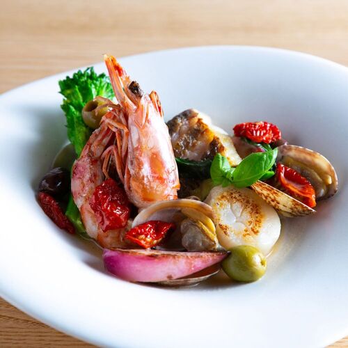 As a seafood wholesaler, Zucchero offers seafood dishes in abundance and having worked in both markets and kappo, the chef has learned the skills of handling fish. The menu changes daily, with an impressive lineup of seafood in season. Dishes are simple, including fare such as carpaccio, fritters and stewed tomatoes. A point of pride is that dishes arrive piping hot. Oven-baked veggies served in the pot and steaming plates of pasta testify to the chef’s passion for his craft.