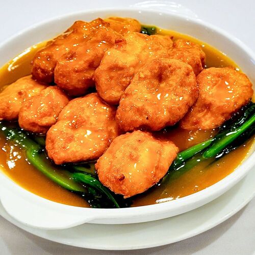 With ceiling fans, bowl pendant lights and Lingnan-style stained glass, the room is the epitome of yesteryear glamour. The menu is likewise dominated by traditionally made Cantonese favourites - diced pork fat gives har gow extra depth of flavour and the white sugar sponge is perfectly proofed without a hint of sourness. Don’t miss their green chillies stuffed with minced dace, double-boiled soups or seafood dishes.