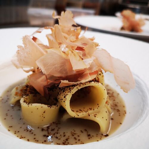 In a cobbled street in Bordeaux's old town, Lume enchants with its intimate atmosphere and Italian cuisine. Venetian chef Riccardo Suppa showcases seafood and organic vegetables in elegant dishes served on crockery handcrafted by a local ceramist. The creations on the single set menu include a flavoursome reinterpretation of pasta e fasioi made with Zolfino beans, pasta mista and scallop crudo; or for dessert: pear, Barena honey and a touch of umeboshi. Authentic food to be savoured in a cosy and inviting setting.