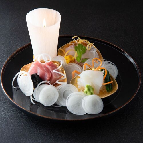 The name is a mashup of the name of the couple who founded the restaurant and the phrase ‘bumbu-ryodo’, ‘accomplished in both literary and military arts’. The phrase expresses the spirit of the chef, who devotes himself to both cooking and service. The third-generation chef commands the kitchen, guarding the flavours inherited from the first. Unmoved by an age that craves all things new, the chef passes on the handiwork and cuisine of the good old days. The simmered vegetable assortment is one example. With skilful knife work and carefully calibrated addition of dashi, the chef brings guests the flavours of the season.