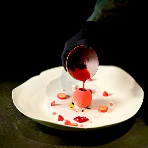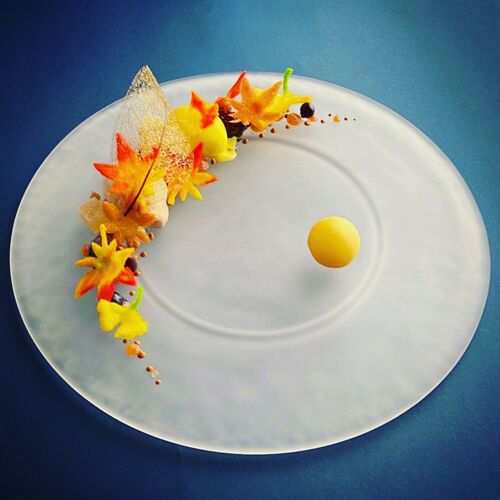 An artwork resembling a planet dominates the dining room. Look closely and the ‘planet’ contains overlapping images of cuisine, which gather together to form a picture of the Earth. ‘Dialogue with the Earth’ is, indeed, the theme of this restaurant. The experience of growing up amid the beauty of nature shaped the bold world view of Hajime Yoneda. The digitised recipes and detailed cuisine attest to his experience as a system engineer. Cuisine that draws inspiration from all Creation is imbued with love and respect for nature.