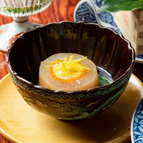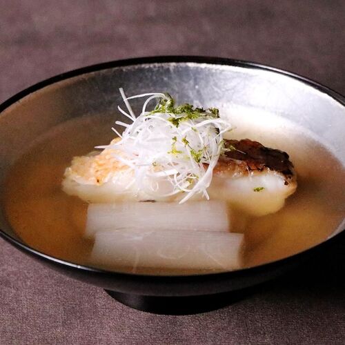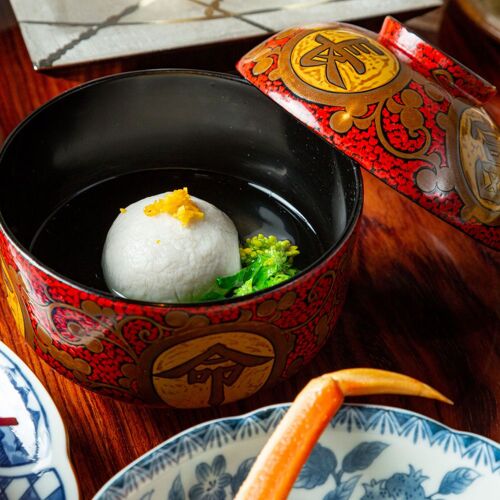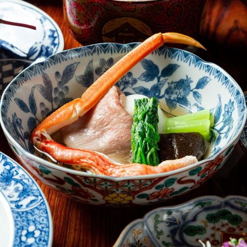 The menu, incorporating seasonal ingredients when available, changes each month. The head chef, whose passion is cuisine that sparks conversation, respects tradition while sneaking a little playfulness into his menus. Even familiar items are presented with ingenuity. The crab croquettes, for example, are suffused with the aroma of toasted crab shells to add the flavour of baked crab to the creamy fillings. The counter sports a stylish, modern design. Five private rooms are also available.