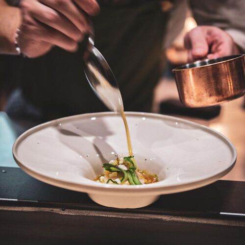 Jakob Schmid and Daniel Reifecker are the pair at the helm – an owner and chef duo who take real pleasure in their work here in a somewhat inconspicuous location outside the town centre. They rustle up a surprise menu with four to seven courses (a vegetarian version is also available if ordered in advance) including dishes such as "Enoki. Potato. Onion" or "Salzburg prawn. Pea. Tomato", for example, that demonstrate creativity and terrific ingredient quality. The friendly team competently explains the dishes to you. The food is accompanied by wines, non-alcoholic drinks or a mixture of both. The atmosphere is relaxed and unpretentious. In good weather, they also set up tables on the terrace.