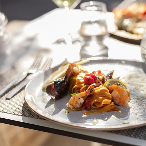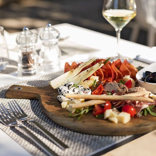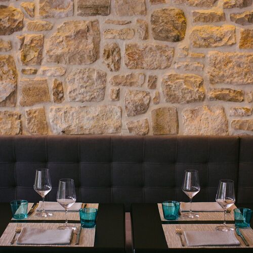 Located on the ground floor of Hotel Osam, in the heart of a picturesque seaside town, this restaurant offers a delightful cuisine inspired by island traditions, balancing land and sea with classic recipes and local ingredients. Among the specialties, standout dishes include shrimp and cherry tomato skewers with a creamy butter and lemon sauce, and flavorful chicken thighs cooked under a brick. The pleasant outdoor area, shaded by ancient olive trees, makes the experience even more relaxing. For an aperitif or after-dinner drink with a view, it’s worth heading up to the rooftop bar, which offers stunning vistas of the sea and the town of Supetar.