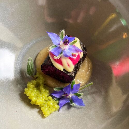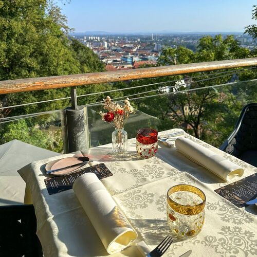 This restaurant boasts a truly unique location, clinging to the side of a steep slope – and affording a magnificent view over Graz! In what used to be a winegrower's house (built in 1820), Manuela and Milivoj Novak are at your service. The chef-owner also supports Manuela front of house. Their single "surprise" menu is served to all guests – the meal begins at 7pm. It's best to arrive a little earlier to take in the fantastic view of the city from the small terrace. To get here, you have two options: either a walk along the Schlossbergsteig or the Schlossbergbahn funicular plus a 5min walk to the restaurant.