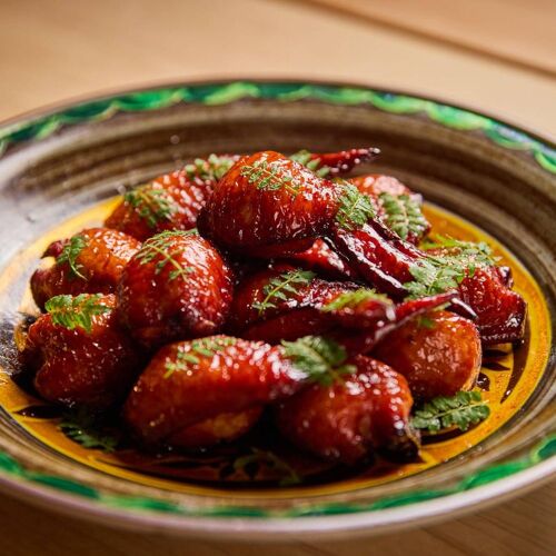 The chef expresses the seasons through yakitori and other Japanese cuisines. Prix fixe dining begins with seasonal vegetables, showcasing his experience in creating beautiful arrangements. Each cut of chicken is selected from various regions and brands. To create a gradual progression from light to rich flavours, yakitori is seasoned with salt in the first half of the meal, and with sauce in the latter half. Between the skewers, dishes such as wanmono with chicken-shinjo are served; a typical closer is takikomi-gohan of vegetables and minced chicken. Each prix fixe yakitori menu captures the ever-changing season.