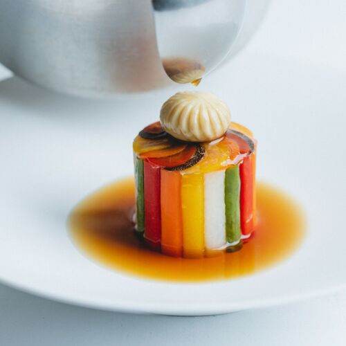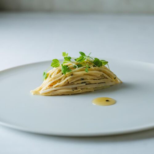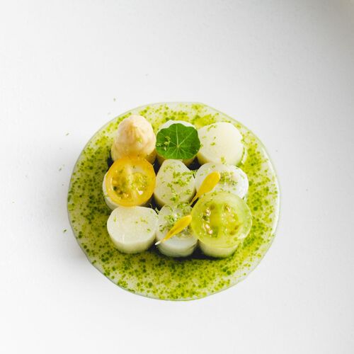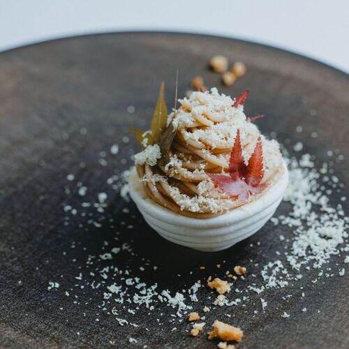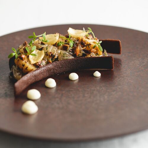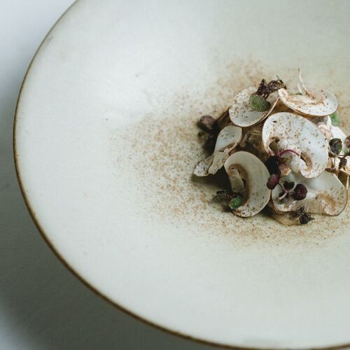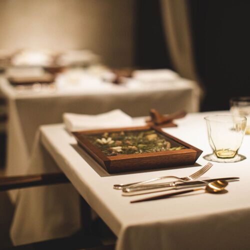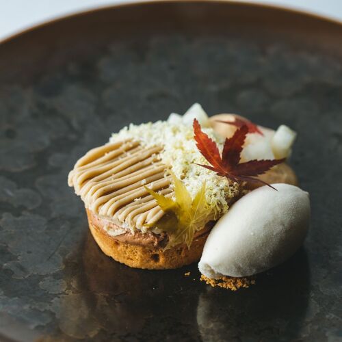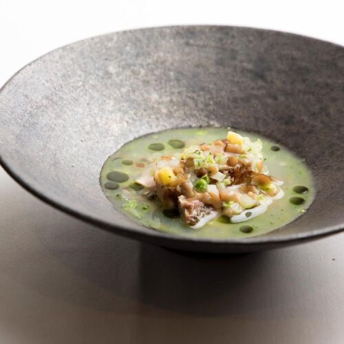 Takuto Murota procures ingredients himself, hunting game in the mountains and growing vegetables in his home garden. Harmonious coexistence with nature is the theme of his cooking and nowhere is this conviction more evident than in his game dishes. Meat is grilled, bones and entrails made into sauces; nothing edible is wasted. Venison blood macarons have become emblematic of LATURE. Classic cuisine with a touch of modern sensibility conveys respect for life.