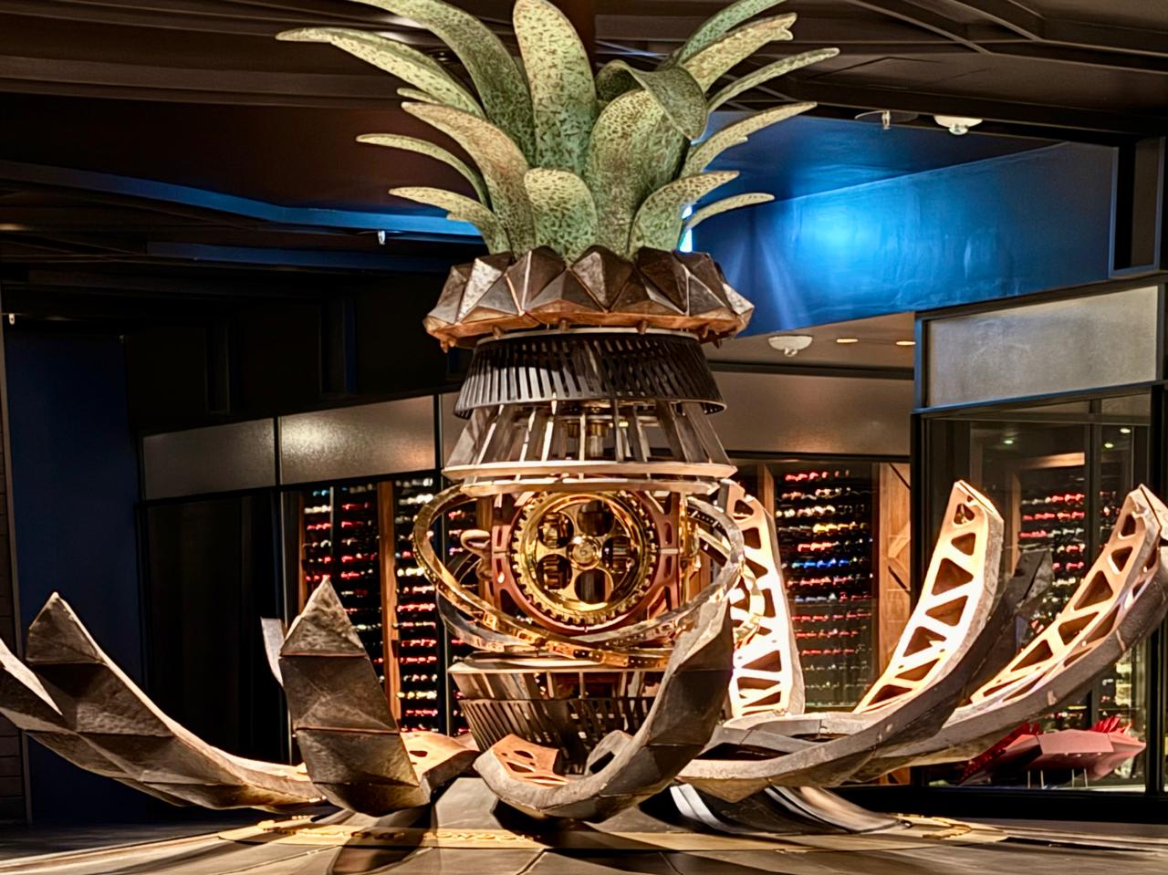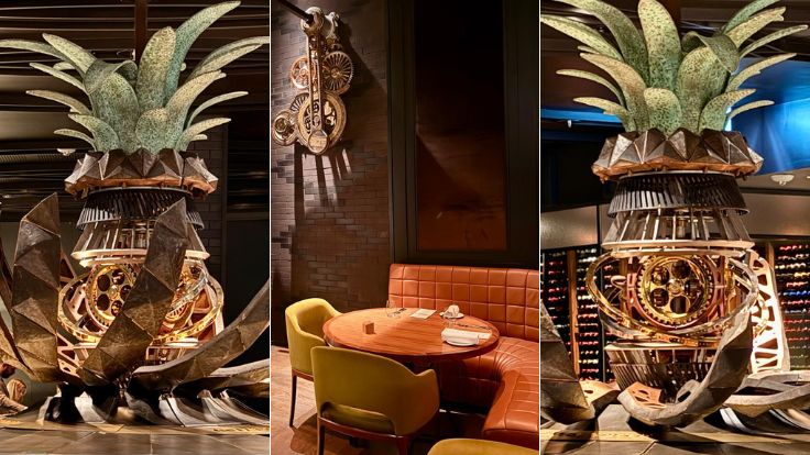 Naturally, the only Three Key hotel in the region hosts a MICHELIN-starred restaurant. Dinner by Heston Blumenthal is nestled in a space that blends modern art deco with whimsical charm. At the entrance, wooden walls carved with quirky, fantastical creatures set the tone for what’s to come.Inside, the main dining room is dimly lit, with black-painted brick interiors creating a cozy yet dramatic ambiance. A mechanical pineapple — a nod to Blumenthal’s famed tipsy cake — slowly opens and closes, as it connect to the real pineapples caramelizing on a spit roast in the open kitchen. Leather quilted booths and suede green chairs surround a mix of circular and square tables, completing the theatrical setting.