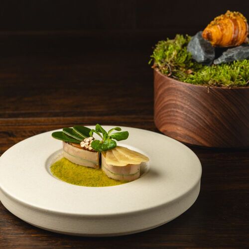 Exclusivity is a word that comes to mind when thinking about this small restaurant in the Fährhaus hotel: a prime location on the Moselle riverfront, an elegant, upscale interior accommodating only 20 diners. Four of these are at the Chef's Table in the open kitchen, which is visible from every corner. Right at the pass, the chefs welcome you with a first pre-dinner drink. The culinary reins are held by Yannick Noack, previously acclaimed for his work at PURS in Andernach. He serves up a modern and creative take on classic cuisine. Dishes such as Breton sole with Savoy cabbage, red pepper and ox marrow, and venison with pistachio, Cherry Coke and beetroot are delicately crafted and exhibit remarkable finesse. Order à la carte or compile your own set menu with five to eight courses. Wine pairings are available. With an emphasis on European labels, the well-curated list is complemented by an appealing range of house-made alcohol-free options. Polished and professional service provides the perfect finishing touch.